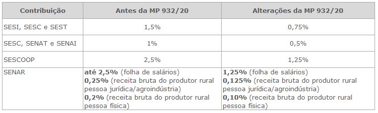 Publicada em 31/03/2020, a Medida Provisória (MP) nº 932 prevê a redução temporária (entre 01/04/2020 e 30/06/2020) de alíquotas das contribuições especiais ao chamado ‘Sistema S’, conforme abaixo: