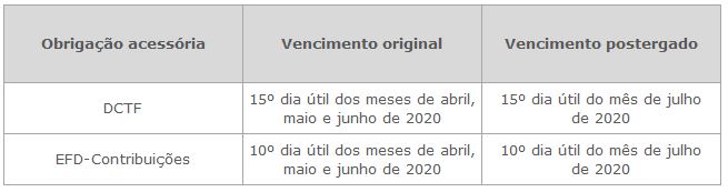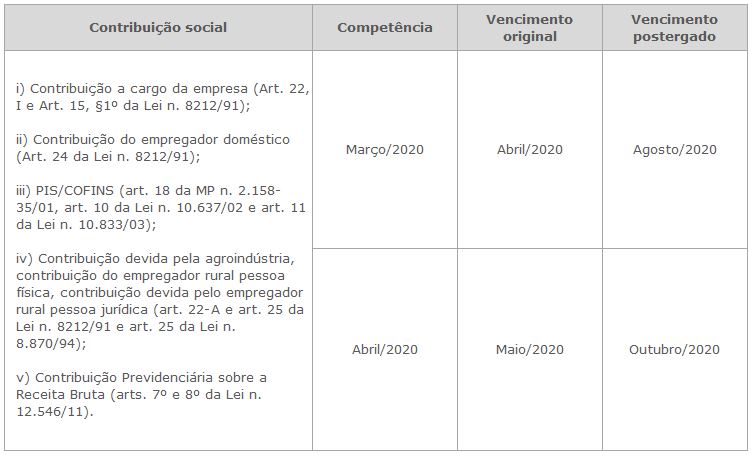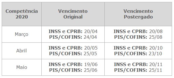O prazo de vencimento da contribuição previdenciária patronal, das contribuições ao PIS/Pasep e da Cofins, das contribuições devidas pela agroindústria e empregadores rurais (Funrural) e da contribuição previdenciária sobre a receita bruta (CPRB) foi postergado em relação às competências dos meses de março e abril de 2020, conforme abaixo:
